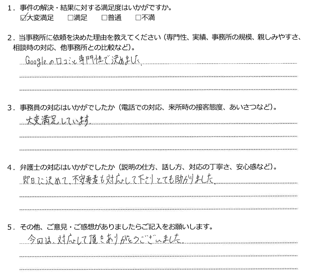 即日に決めて不安要素も対応して下さり、とても助かりました。